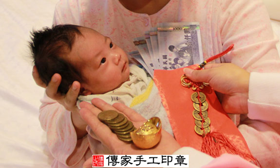 為羅寶寶準備的1000元大鈔,五帝錢和紅包袋。紅包袋裡面裝千元大鈔:象徵「孩子能賺大錢」,
