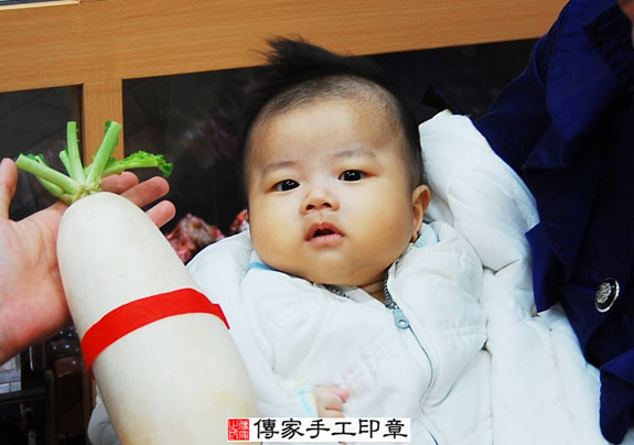 為盧寶寶準備的大蘿蔔。蘿蔔「代表的含意:蘿蔔就是好彩頭,象徵孩子一生好運源源不絕」