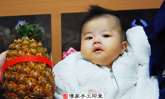 為盧寶寶準備的鳳梨。鳳梨「代表的含意:鳳梨就是旺旺來,象徵孩子一生好運旺旺來」