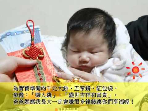 為張寶寶準備的1000元大鈔,五帝錢和紅包袋。紅包袋裡面裝千元大鈔:象徵「孩子能賺大錢」, 五帝錢:象徵「代表盛世吉祥和富貴」